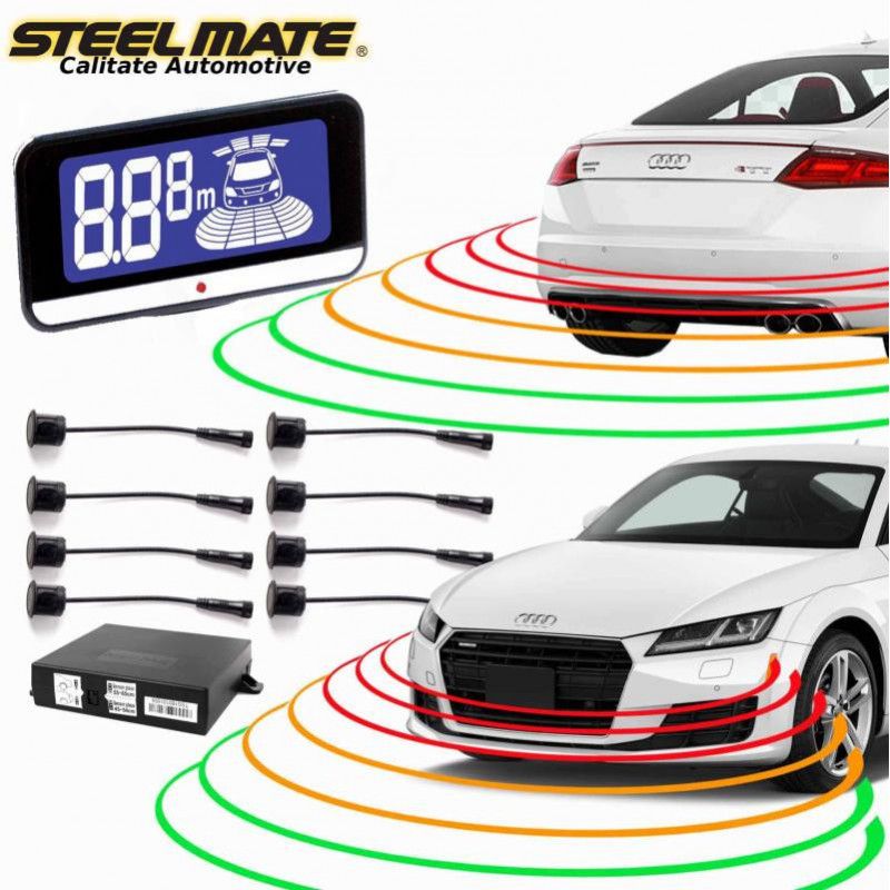 Protecție atât la pietoni cât și la mașini\nSenzorii asigură protecție în timpul parcării atât la pietoni, fie că sunt copii sau persoane adulte cât și la alte obiecte care se află sub nivelul lunetei și pe care nu avem cum să le vedem, astfel prevenind evenimentele nedorite de lovituri sau zgârieturi ale mașinii. Toate parcările reușite cu ajutorul senzorilor de parcare STEELMATE PTS810V10 previn cheltuielile nedorite la service și timpul pierdut în astfel de situatii. \nSiguranță la volan\nAcest kit de parcare fata si spate, cu 8 senzori ultrasonici, de la STEELMATE sunt capabili să calculeze exact distanța în metri până la orice obstacol, indiferent de factorii atmosferici: ploaie, ninsoare sau ger. |