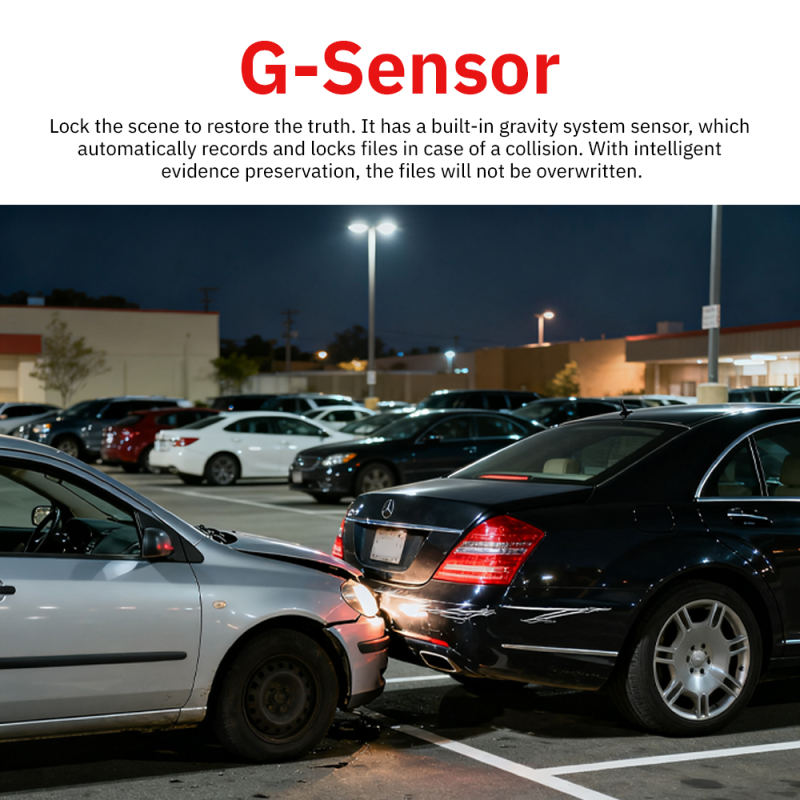Senzorul G (senzor de gravitate) detectează coliziunile și blochează automat secvența video curentă pentru a preveni ștergerea acesteia. Această funcție garantează păstrarea probelor în momente critice.